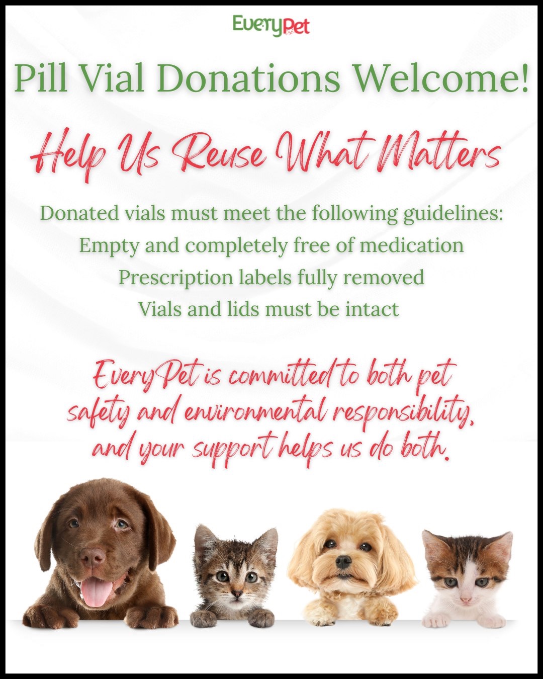 As part of EveryPet’s commitment to both pet safety and environmental responsibility, we gladly accept donations of child-resistant pill vials that can be safely reused in our clinics. Your donation, which can be dropped off at either of our locations, will help reduce waste while supporting affordable veterinary care for pets in our community!