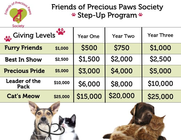 You can also take part in our Step-Up Program, featuring five unique giving levels—Furry Friends, Best in Show, Precious Pride, Leader of the Pack, and Cat’s Meow—each offering special recognition for your ongoing commitment to saving pets and the people who love them.