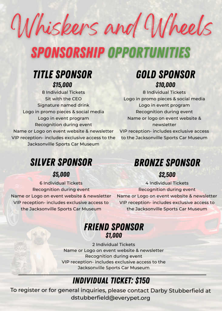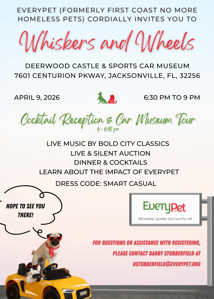 Guests will enjoy exclusive access to a one-of-a-kind collection of some of the rarest and most iconic automobiles in North America, alongside hors d’oeuvres, craft cocktails, and live music by Bold City Classics. The evening will also feature heartfelt dinner testimonials from pets and their owners, as well as both live and silent auctions.